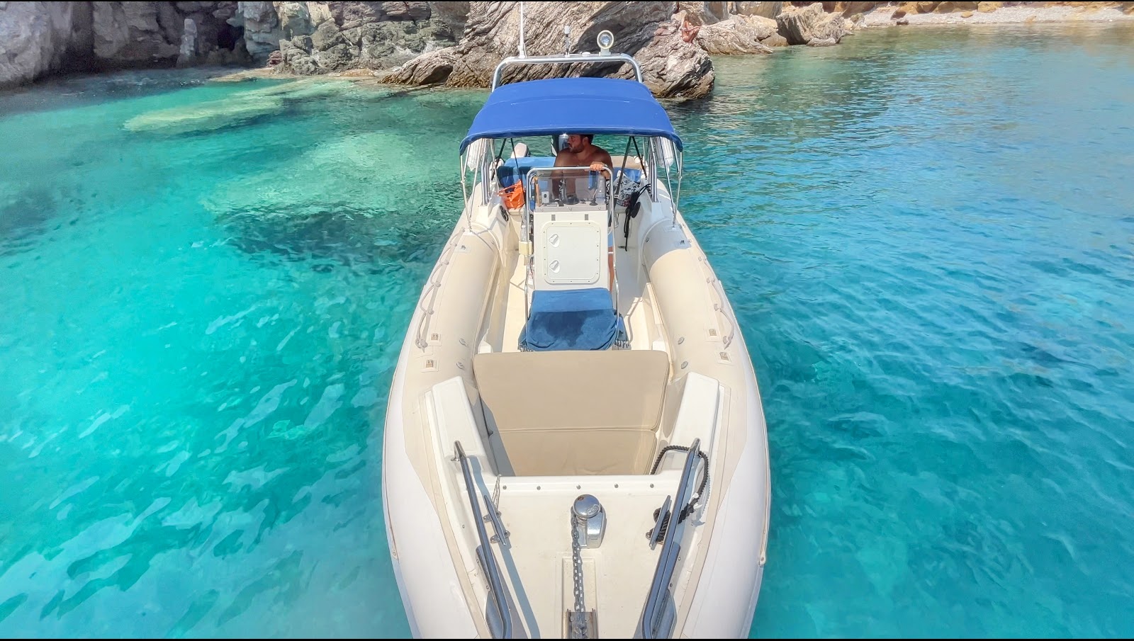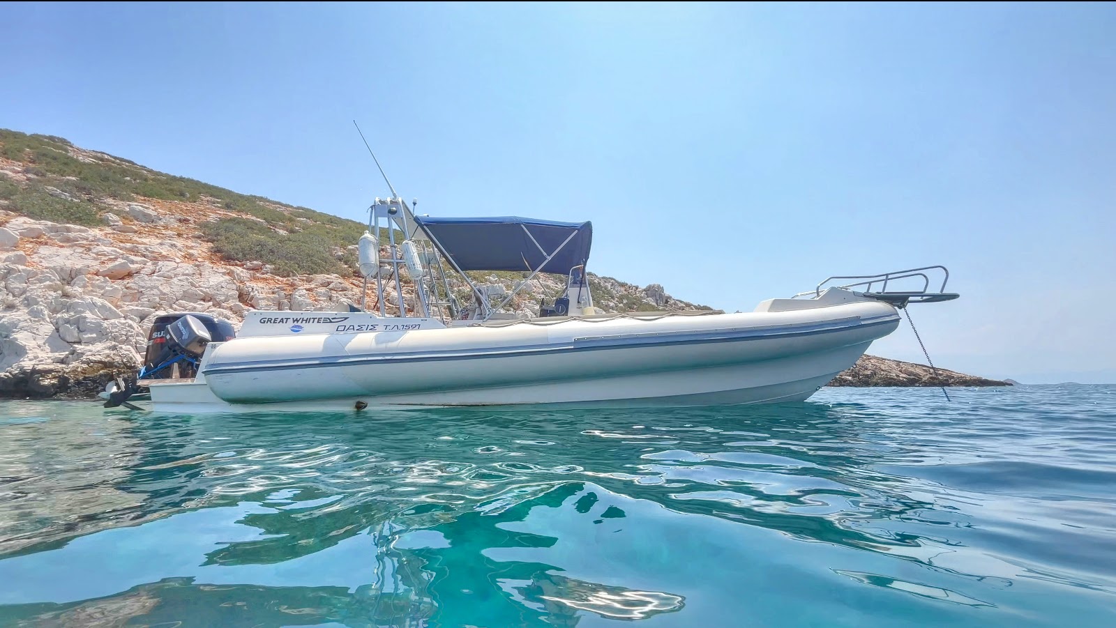 Well known for its smooth ride and seaworthiness, the Great White 750 always manages to impress. It has an overall length of 8 meters and a deep V hull incorporating the characteristics of offshore boats into a rib. Its big swimming platform at the aft ensures easy access to and from the sea. It carries two large sunbeds, one at the bow and one aft which can take up to 10 people. It is equipped with bespoke electronics and hardware.